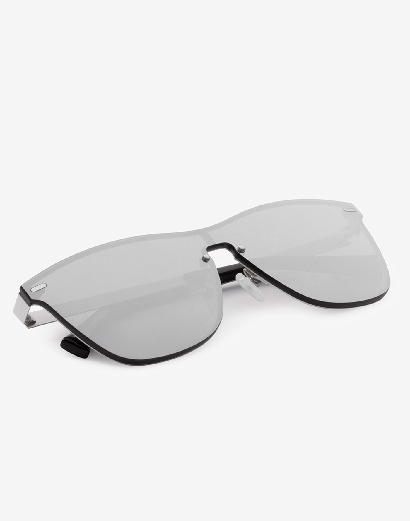 ONE-style full front sunglasses with matte silver metal frame and silver shield lenses.