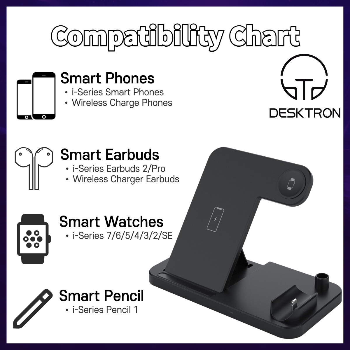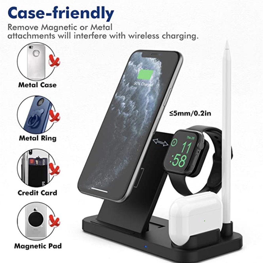 - Specifications:- Material: ABS- Input: 5V/2A, 9V/2A- Output iWatch: 2W- Output Apple Pencil: 2W- Output Airpods: 5W- Output Phone : 5W 7.5W 10W 15(Max)- Color : White/Black- Receiving Distance 2-10mm- Package: 18x15x2.5cm- Packaget Weight: 200Grams- Cable Length 1.2mWhat's in the package?- 1 x 4 in 1 QI Wireless Charging Station- 1 x Type-c USB Charging Cable- 1 x User Manual3 Months Local Warranty*Terms and conditions applied *