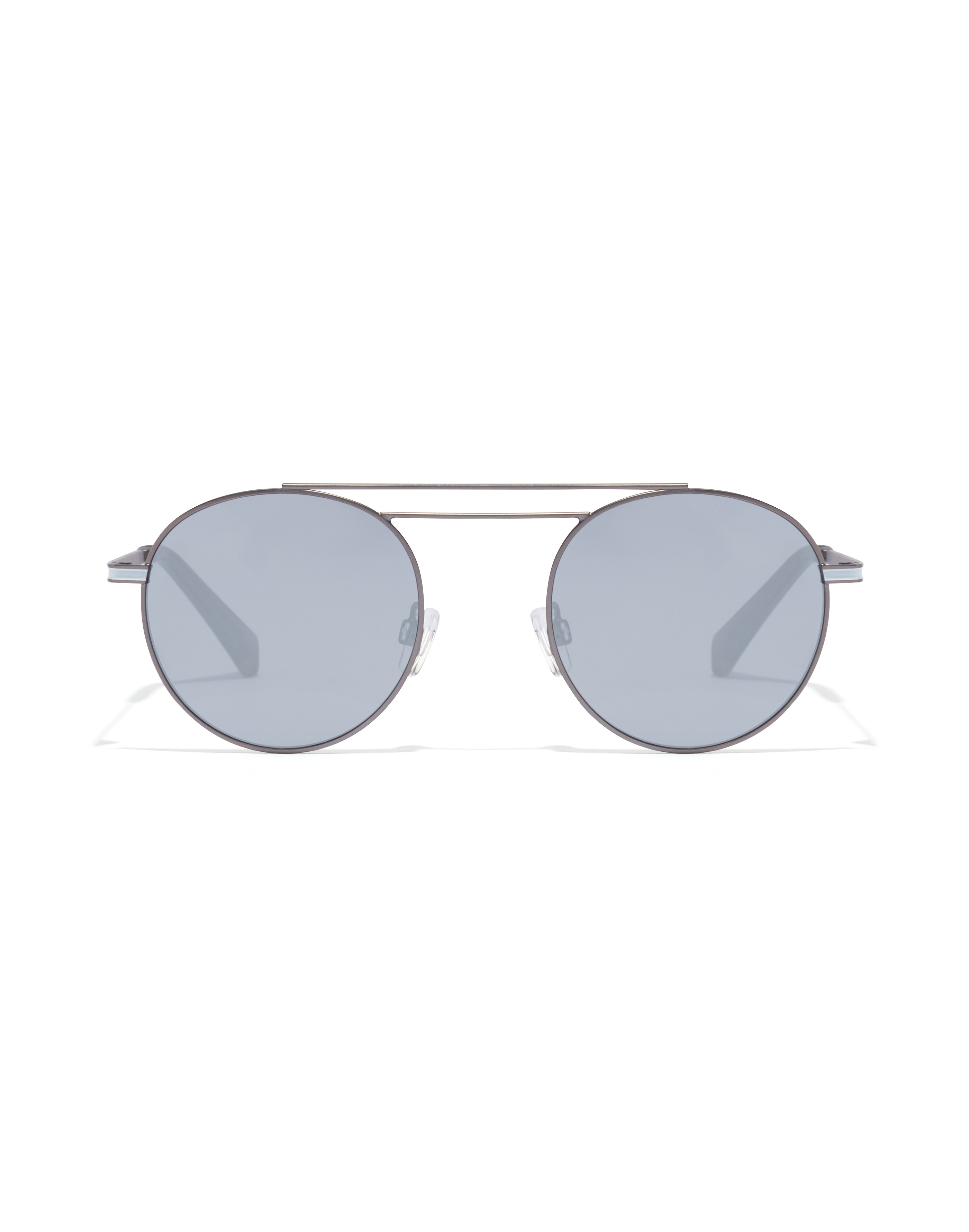 This clean, uncomplicated design combines rounded, mirrored chrome lenses with a matt gunmetal frame with an unusual double browbar and ‘open bridge’. A white inlay along the temples and frosted grey earpieces complete the look.