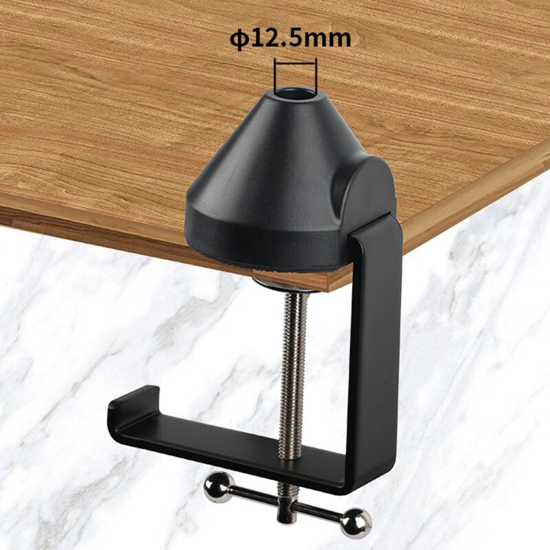 A specially designed table mounting clamp for universal microphone suspension boom scissor arm stand. Heavy-duty metal clip base provides a sturdy and reliable way to hold your microphone stand. Soft foam padding protection at the contact point with table considerately protects your desktop surface from any scratches. Adjustable Table Mounting Clamp is designed to securely mount your microphone stand to table top or other flat surface using an adjustable positioning screw.
