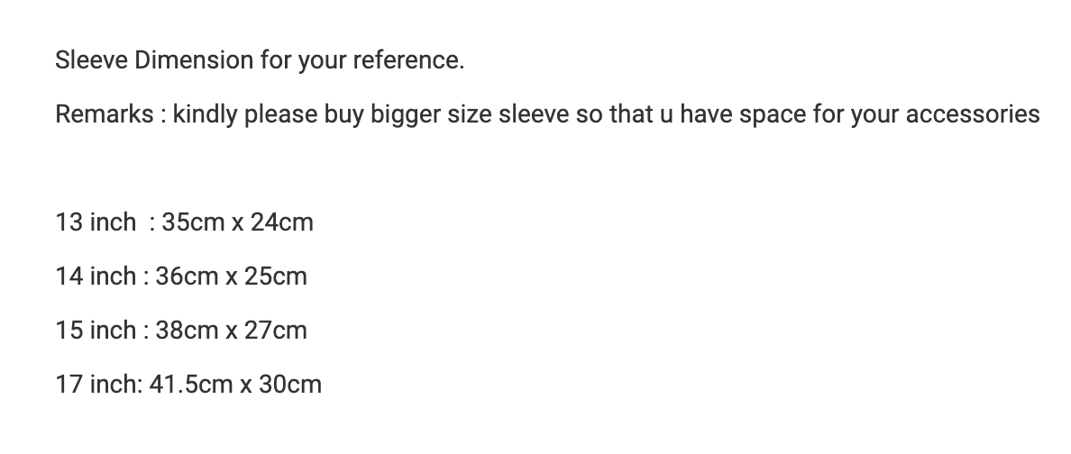 Sleeve Dimension for your reference.Remarks : kindly please buy bigger size sleeve so that u have space for your accessories13 inch : 35cm x 24cm14 inch : 36cm x 25cm15 inch : 38cm x 27cm17 inch: 41.5cm x 30cm