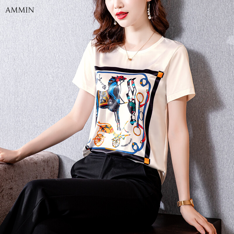 AMMIN 2021 new silk T-shirt women loose short sleeves unique positioning printing white round neck top blouse