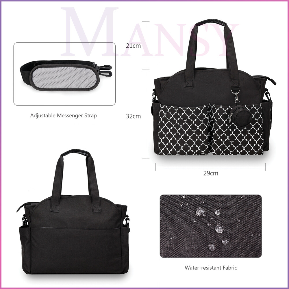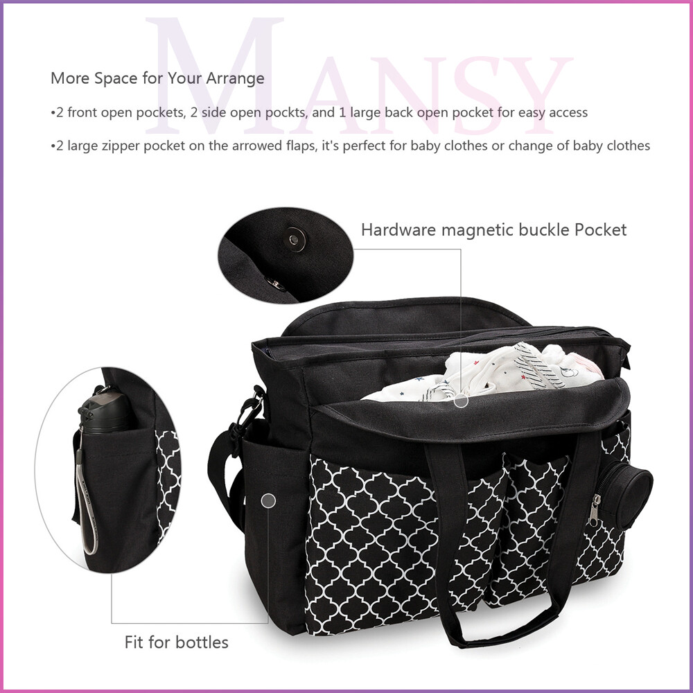 The package contains: 1*diaper bag, 1*Pacifier Case, 1*Adjustable Messenger Strap