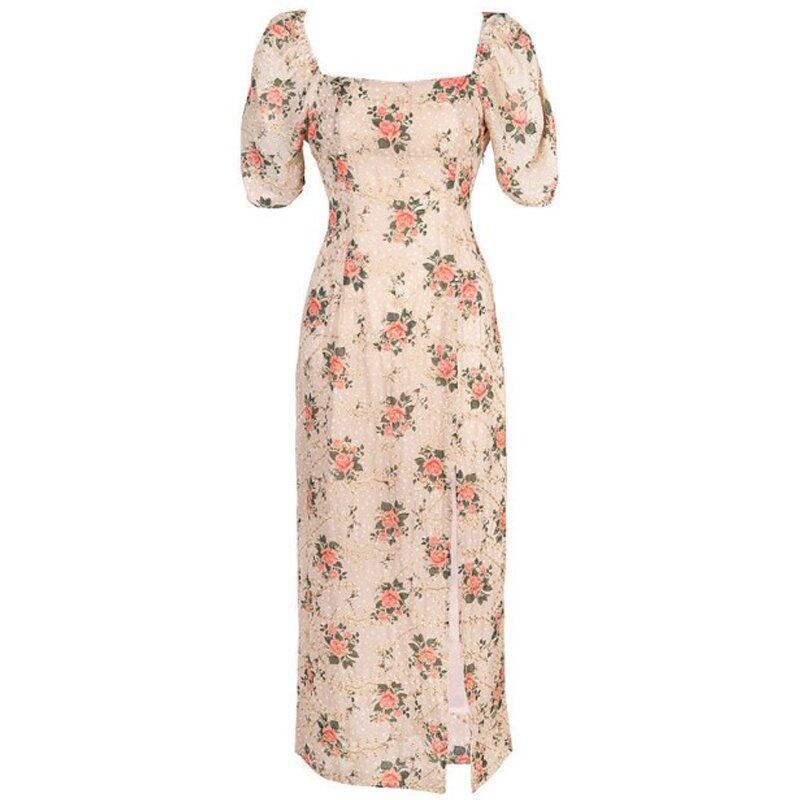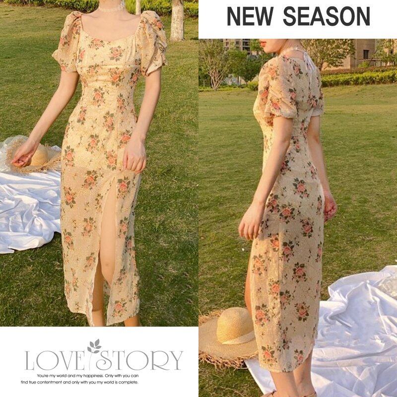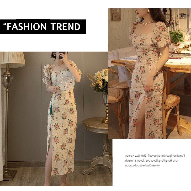 INWPLLR New Arrival Floral Print Women's Dress Fashion Elegant Square Collar Long Dress Summer Style Puff Sleeve Split Dresses Female