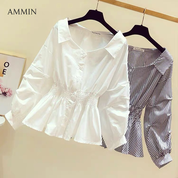 AMMIN Tops 2021 autumn new style V-neck long-sleeved button cardigan cotton shirt women's Korean version of retro Hong Kong flavor elastic waist Western-style loose lantern sleeves solid color blo
