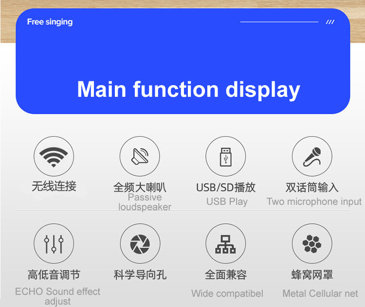 ECHO Function.The player is built with mixing amplifier function ,wirelss microphone is included.No need to match other mixer, amplifier and microphone.It could directly drive 8ohms ,8’’ or 10’’ loudspeaker.The connection is more simple and the cost is lower .