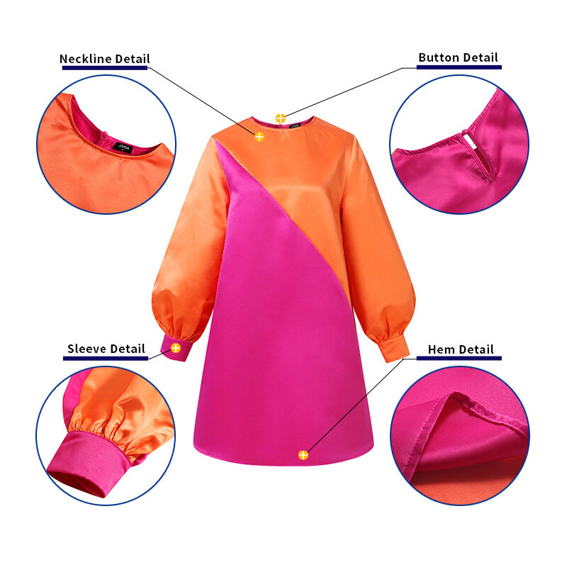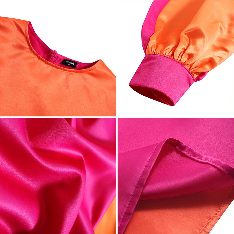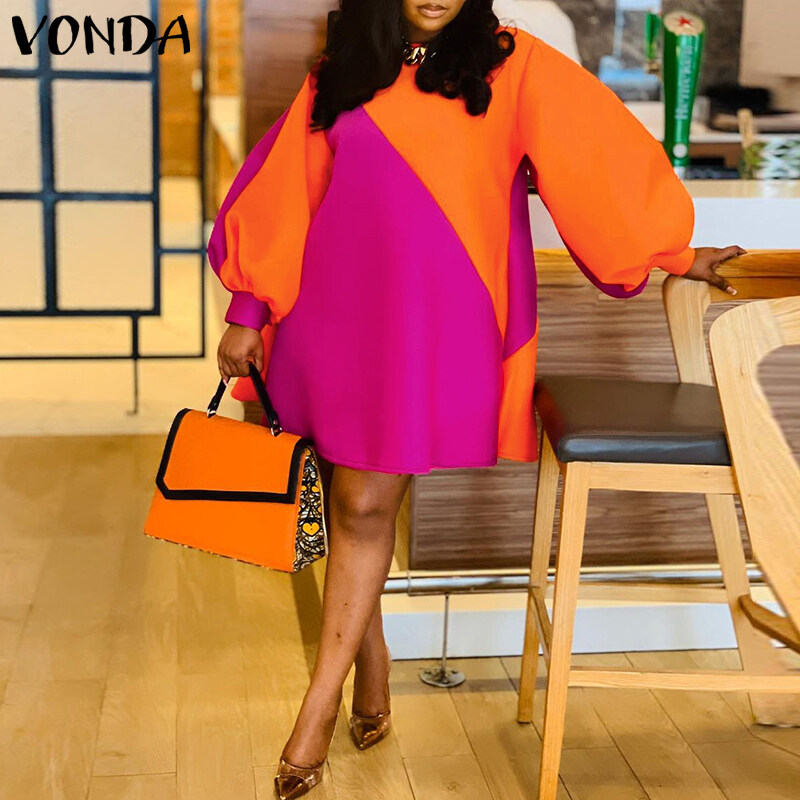 VONDA Orange Women Fashion Patchwork Puff Sleeve Baggy Midi Dresses (Plus Size)