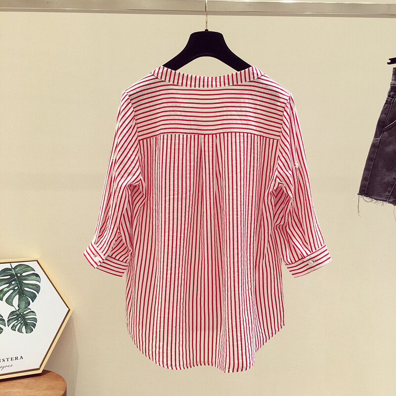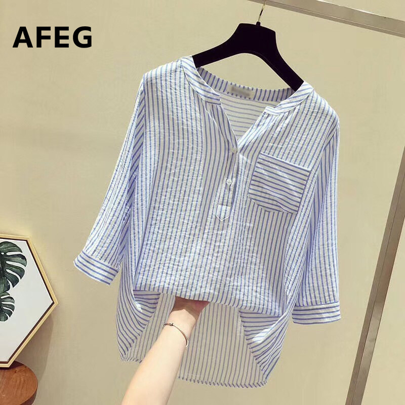 AFEG new Korean version of V-neck fashion loose wild striped three-quarter sleeve blouse for women