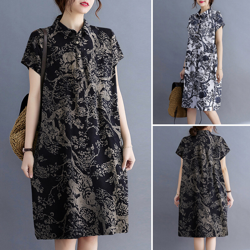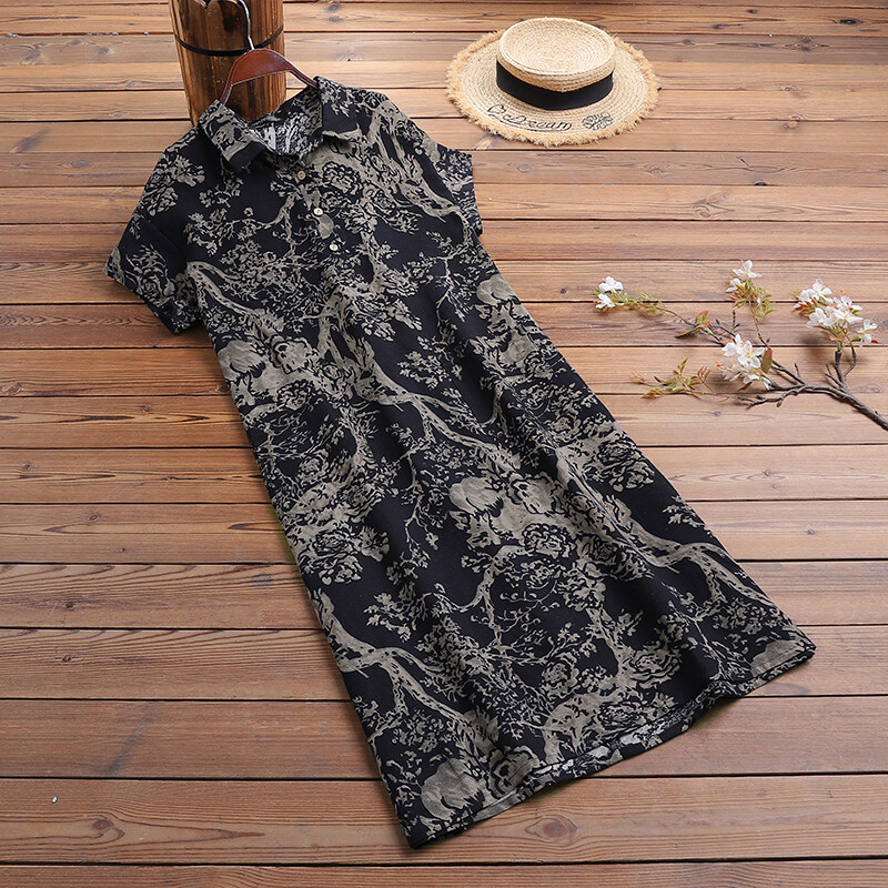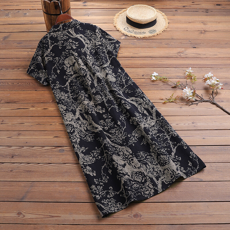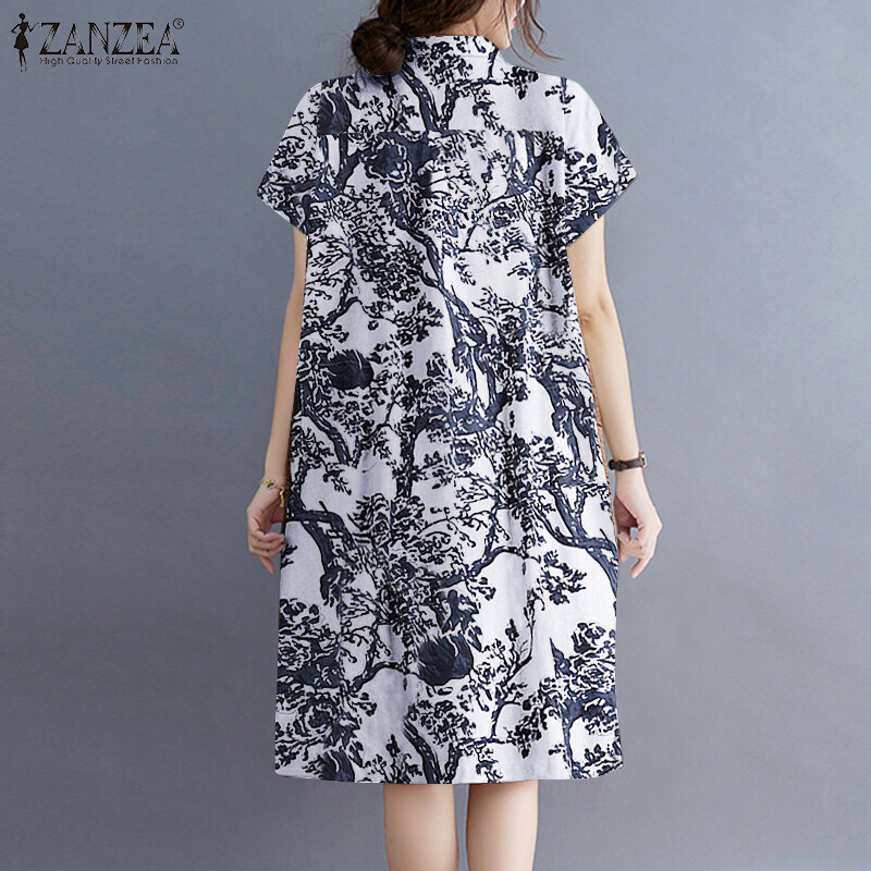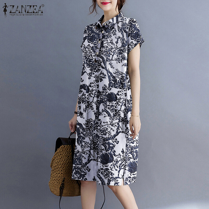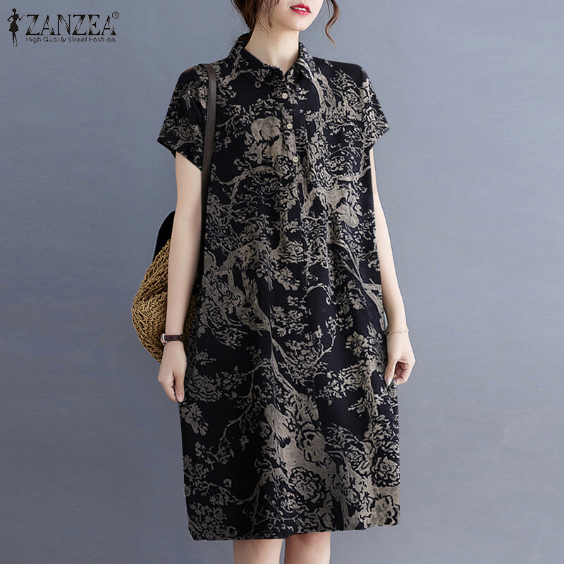 ZANZEA Womens Summer Short Sleeve Button Up Printed A-Line Midi Shirt Dress