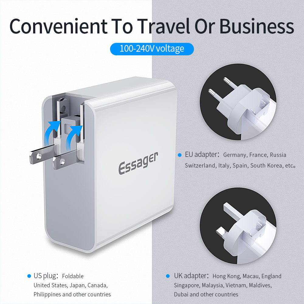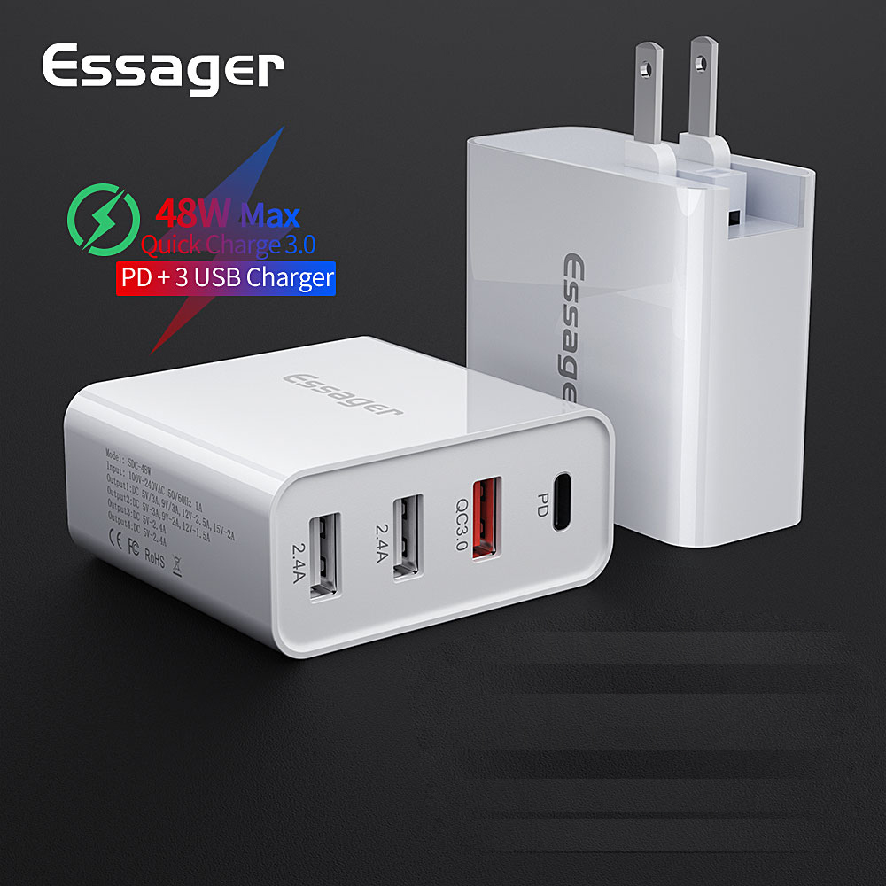 Essager48W 4 Ports Quick Charger PD TypeC + USB QC3.0 Turbo Wall Charger Ponsel Cepat untuk iPhone12 11 Pro max Xiaomi
