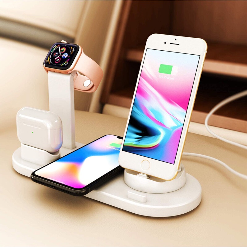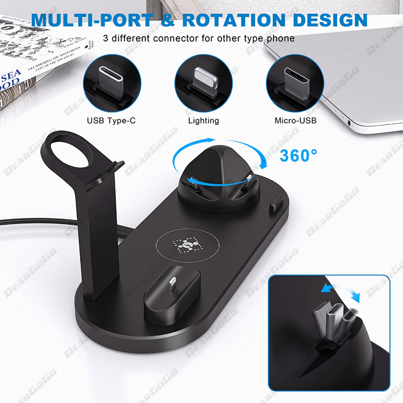 The Smart charging station combined qi fast wireless charger with 3 connectors base charger, iWatch ,Airpods charger and a USB outlet in one holder, support charging your apple watch, Airpods,iPhone/Samsung simultaneously. The 3 connectors base is rotary at 360°, Suitable for iPhone ,Android Type-c and Android Micro-usb cell phones