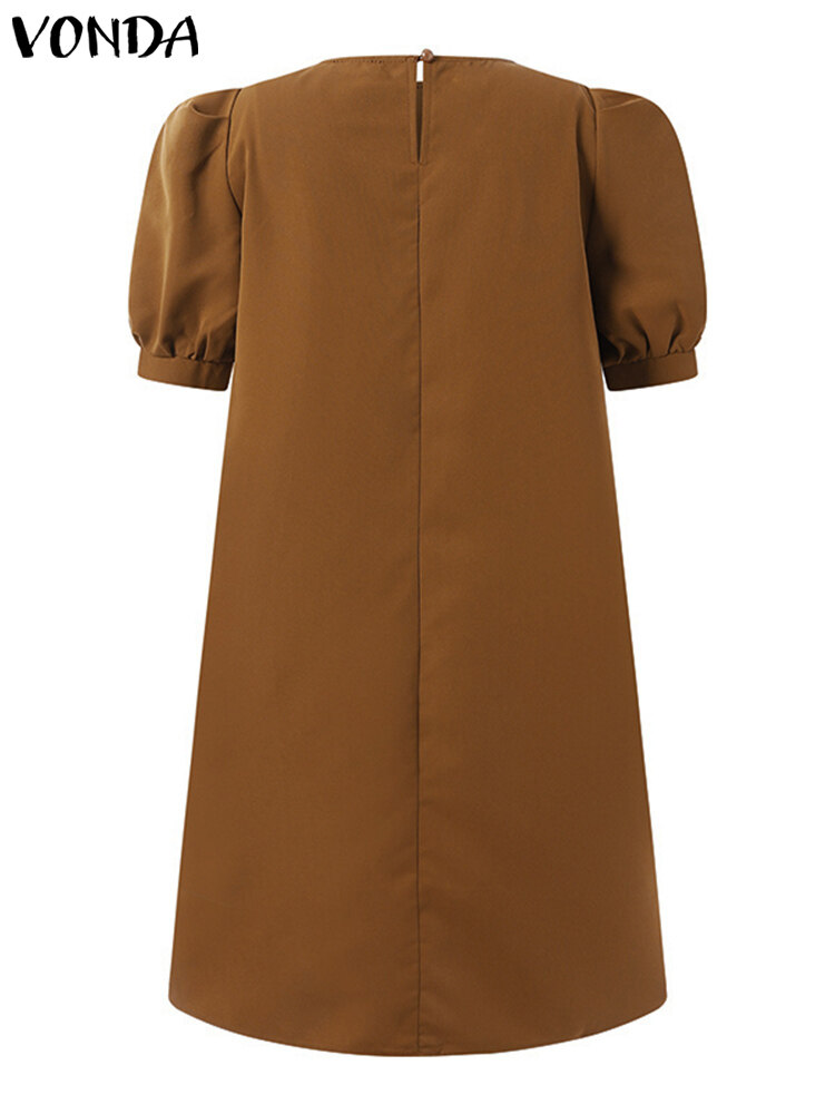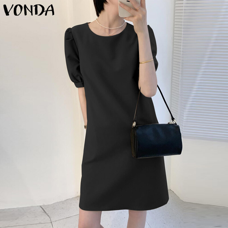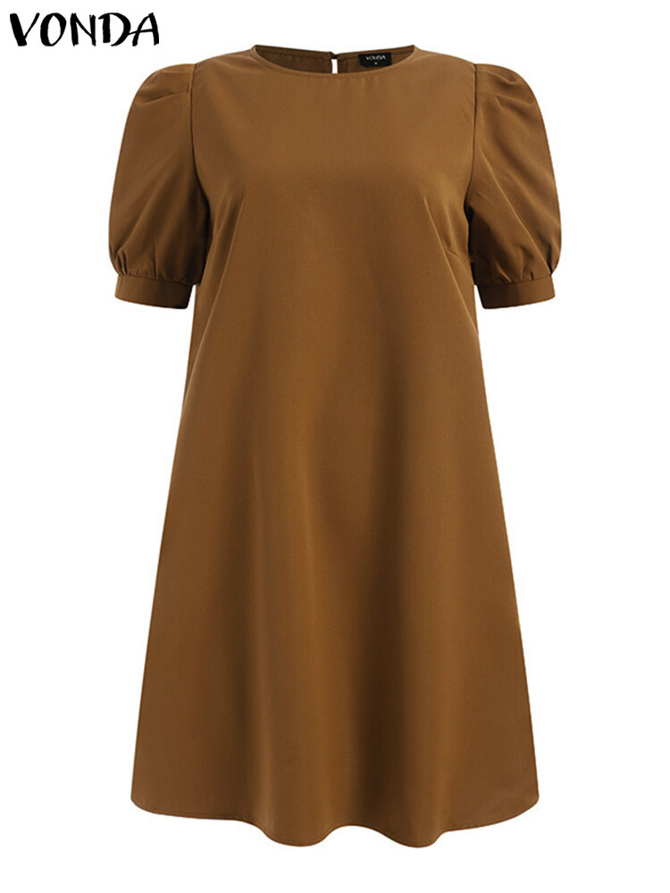VONDA Women Summer Solid Color O Neck Casual Loose Knee-length T-shirt Dress (Korean Causal)