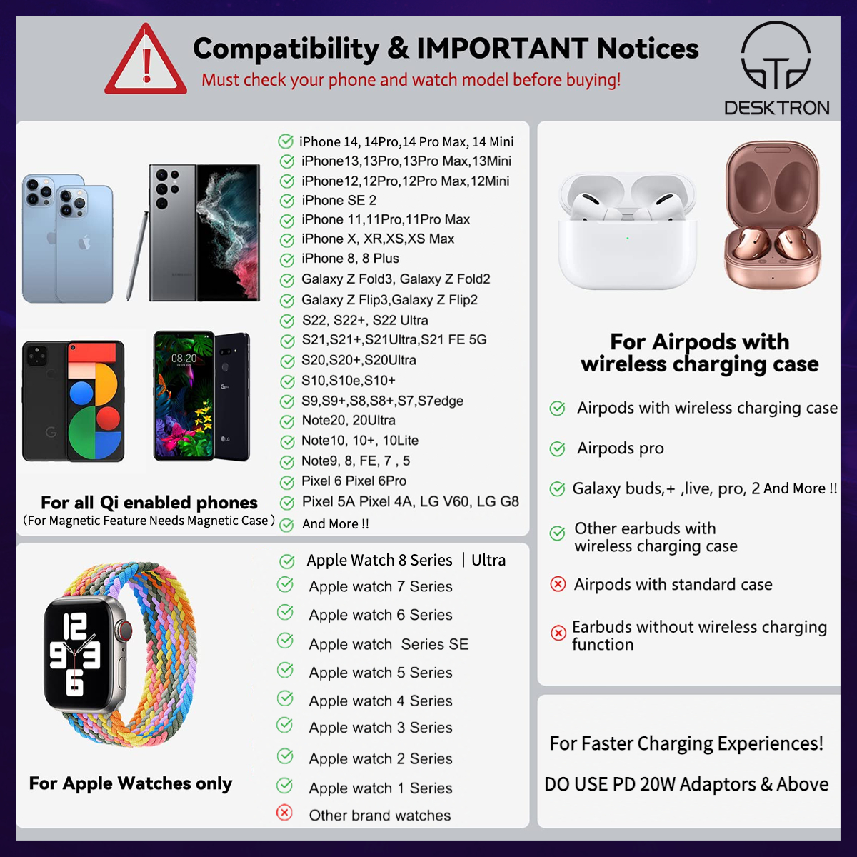 -【Qi-certified AND NO WORRY CHARGING】The charger station uses the most advanced automatic control technology. Equipped with various functions, such as overcurrent, overcharge, overvoltage, overheat, etc., and temperature control function, automatic switch-off, foreign matter, metal object identification, etc. Flashes quickly to ensure your smartphone stable charging, so you can experience wireless charging with total peace of mind