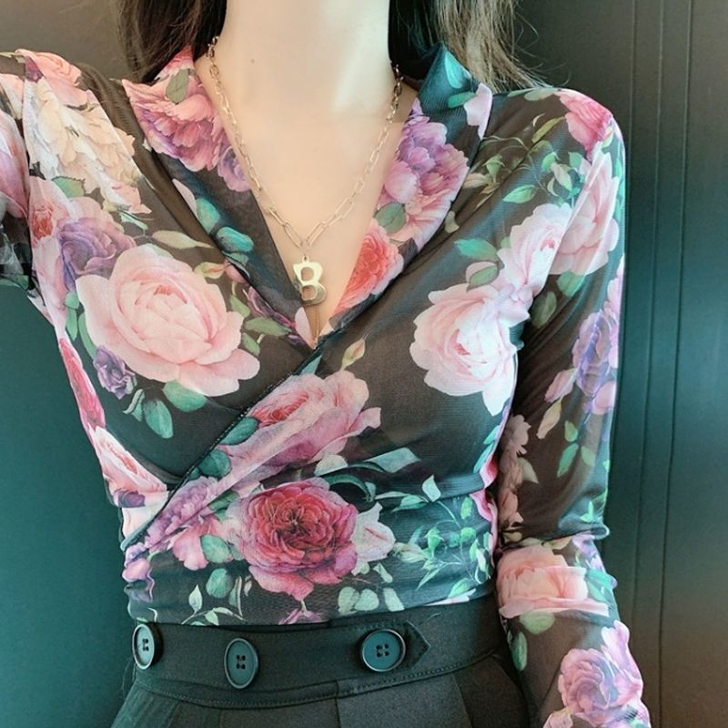 EDQRDQ Women's Floral Print V Neck Self Tie Waist Wrap Crop Top Long Sleeve Mesh Sheer Blouse