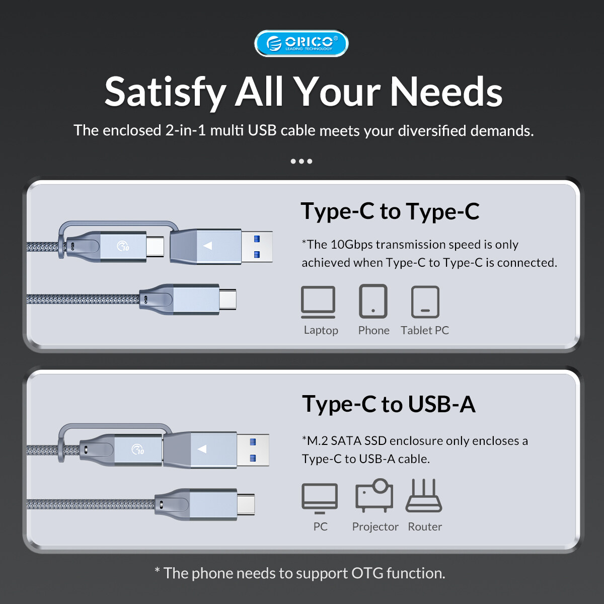 Only support NVME PCI-E protocol M key/M&B Key SSD, with 30cm C to C/A 2-in-1 date Cable.