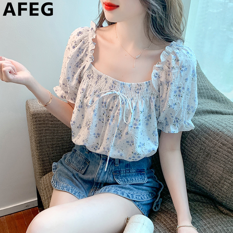 AFEG new Korean style square neck bow fashion loose short sleeve blouse for women