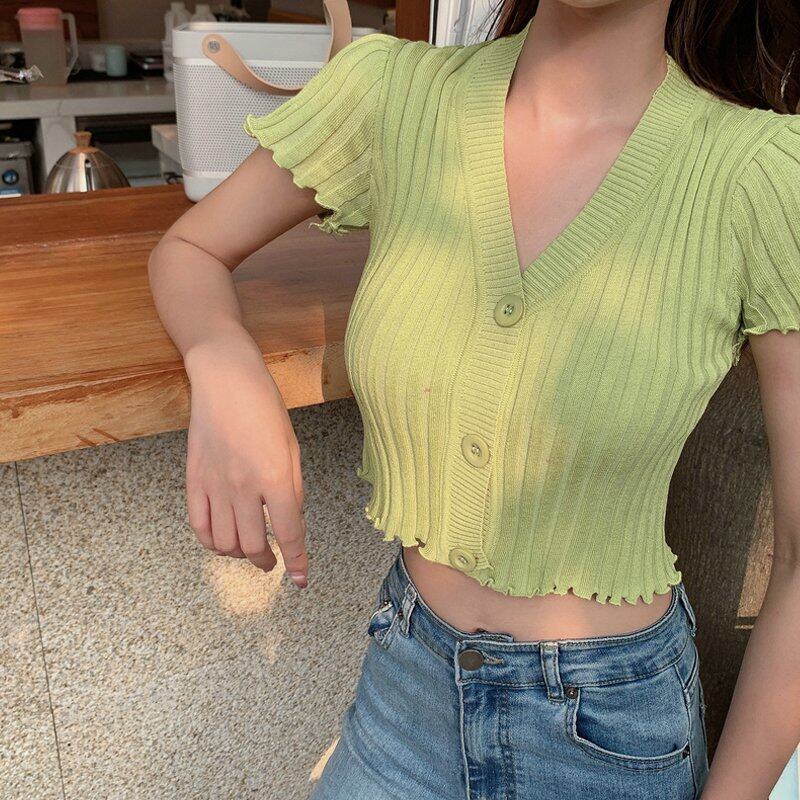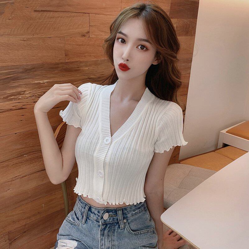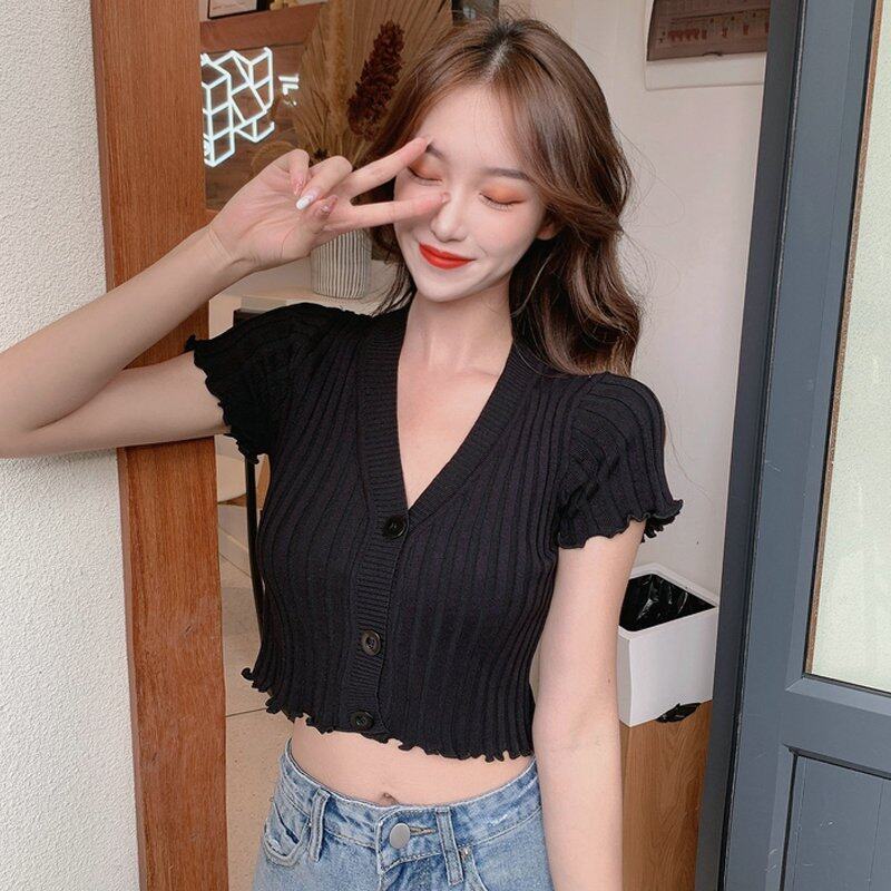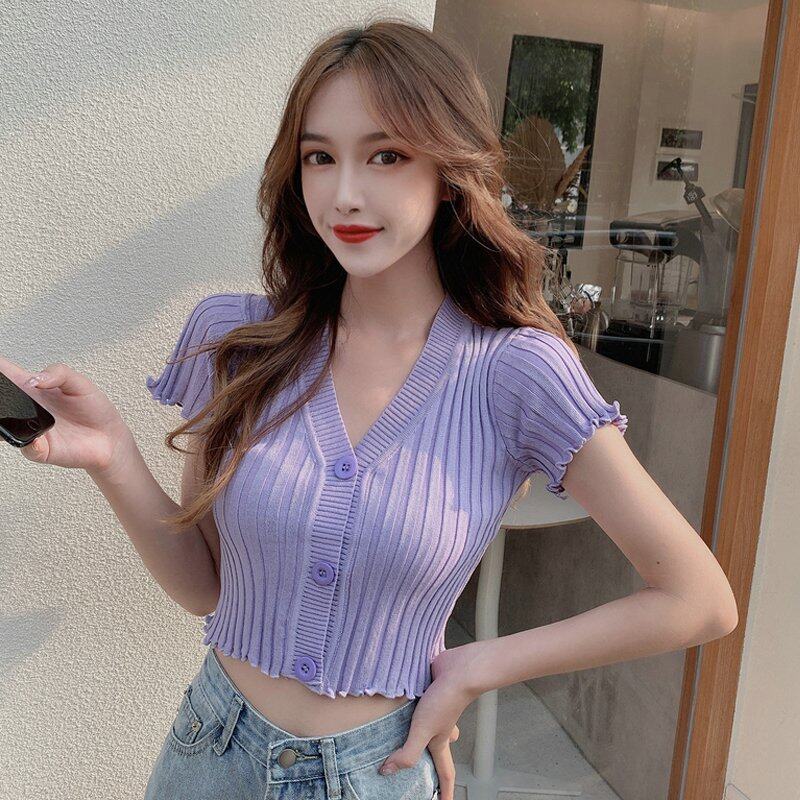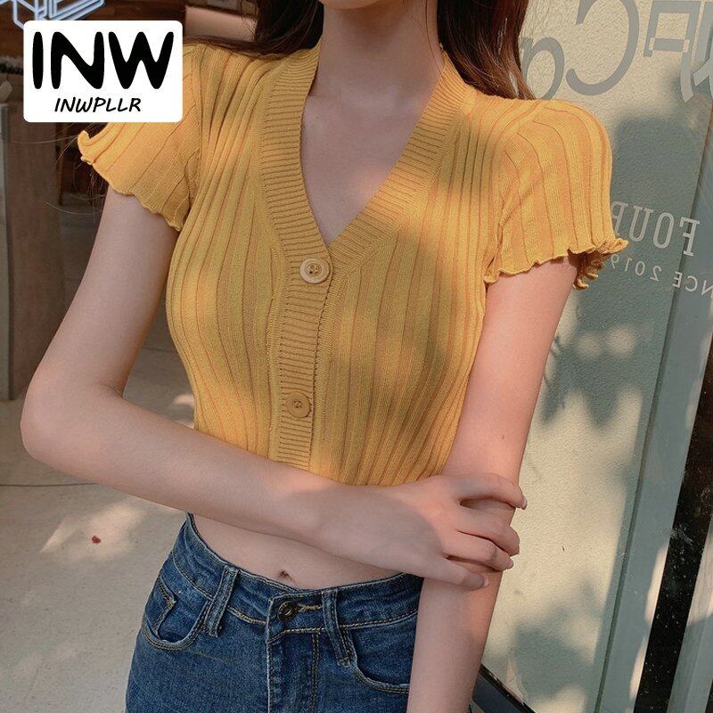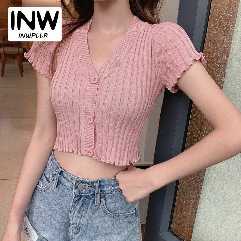 INWPLLR 2022 Women's Crop T-shirt Fashion Botton Short Sleeve Tops Ladies Slim Multi Solid Color Tshirts