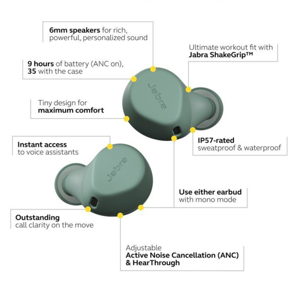 Durable earphones and optimal fit: With Jabra ShakeGrip technology, each bud stays in your ear even during intense workouts - IP57 water and sweatproof