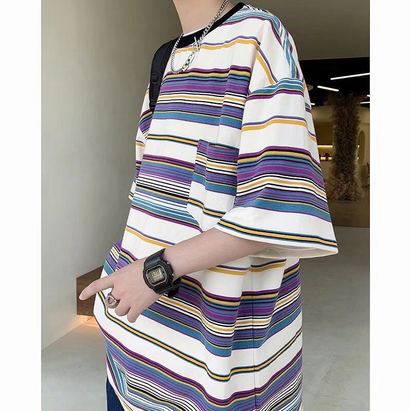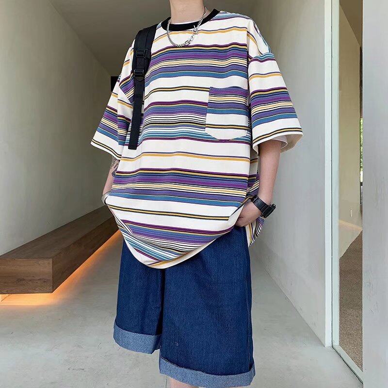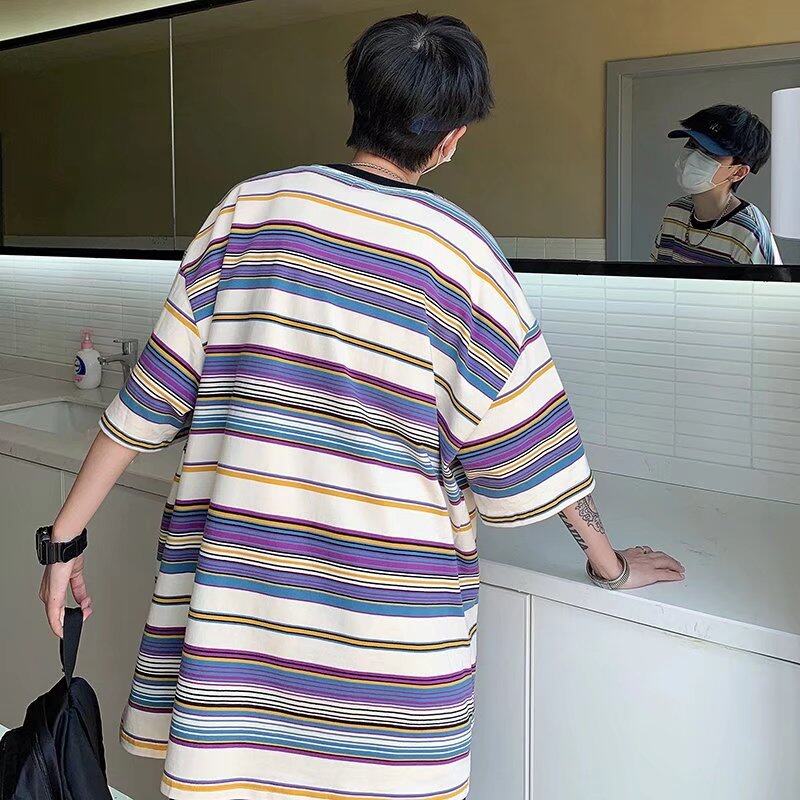 t shirt Men Korean Street Style Oversize Short Sleeve Fashion Tops Casual Stripe Print t-shirt
