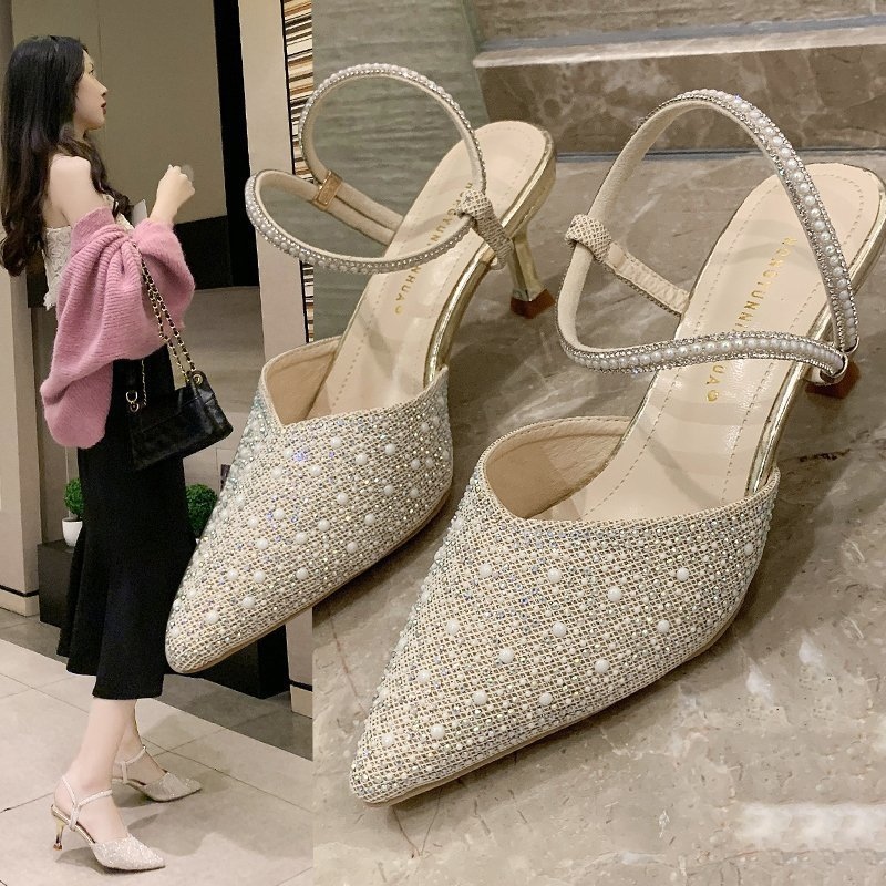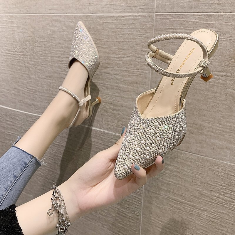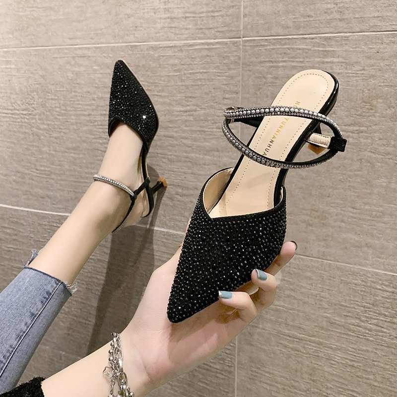 Closed Toe Sandals for Women 2021 Summer New Rhinestone Pointed Toe Two Way Elegant Lady Stiletto Sandals High Heels