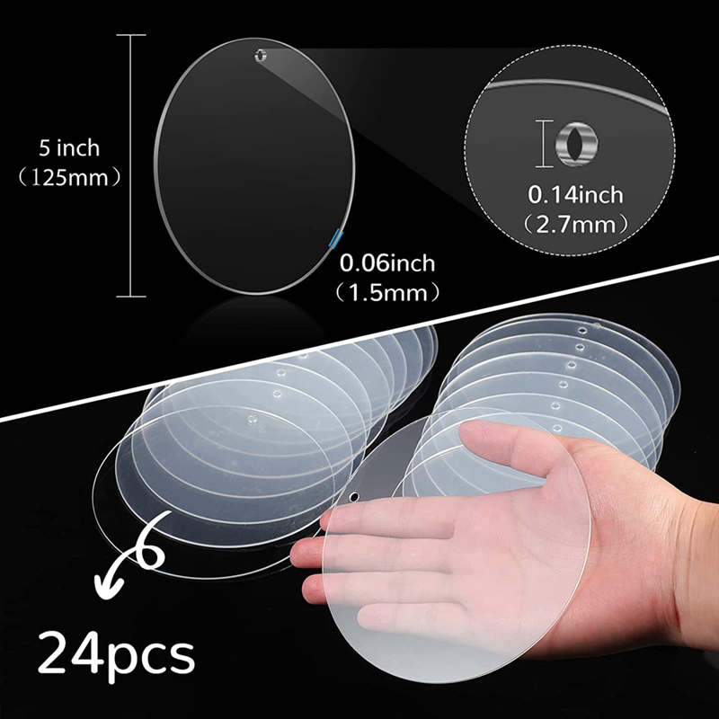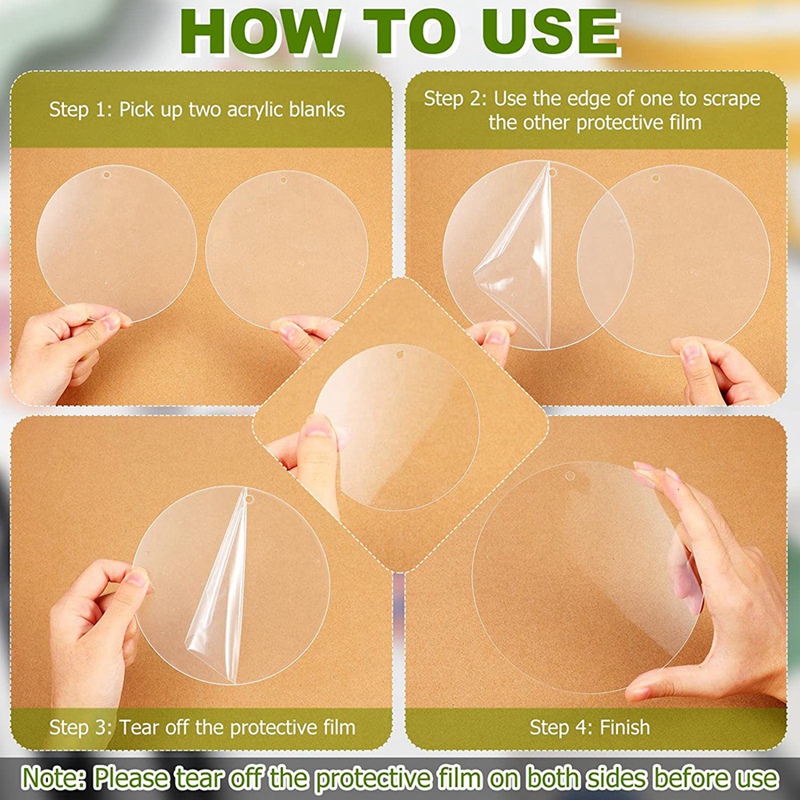 Double-sided protective film: these clear acrylic circle discs are covered with protective film on both sides to help prevent the acrylic blanks from scratching or getting dirty from dust; When you need to use it, just tear it off slowly