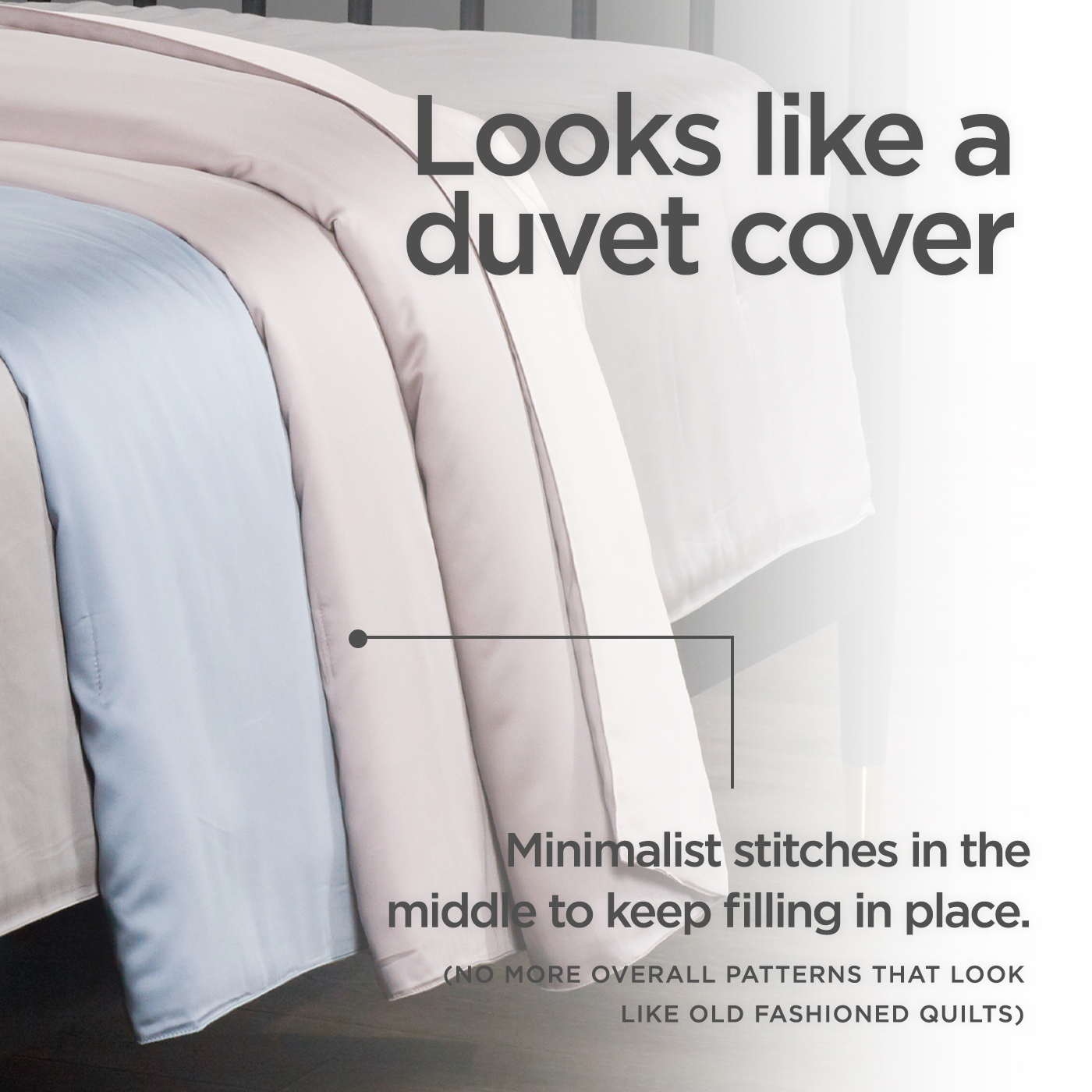 We have designed our light quilt to look exactly like a duvet cover when laid on your bed. To keep the filling in place, we created small stitches across the quilt to ensure a minimalist look for the light quilt. Unlike many other summer quilts on the market with old-fashioned large overall patterns, our minimalist stitches are technically more advanced to produce.