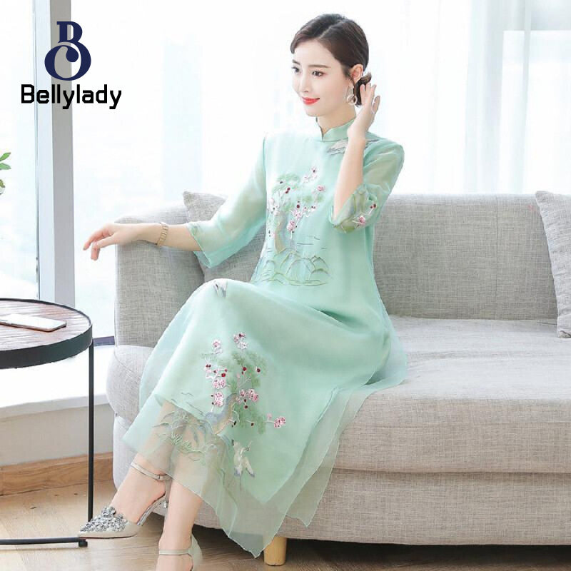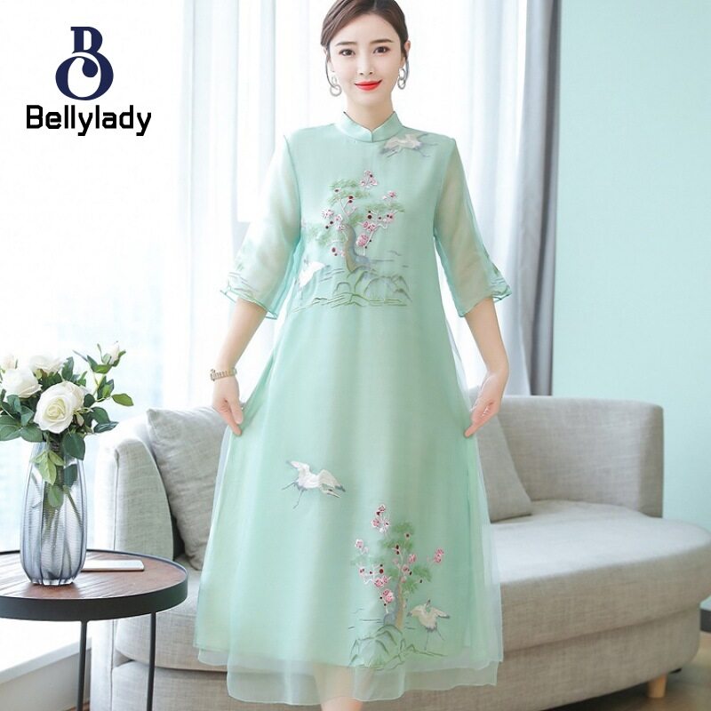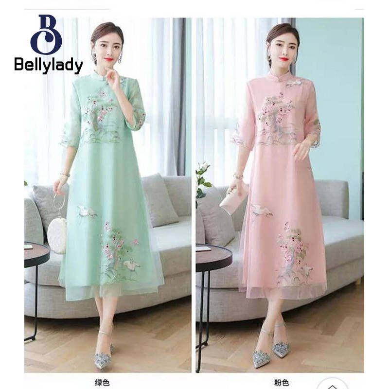 BellyLady Women Summer Embroidered Dress Chinese Ethnic Style Half Sleeves A-line Skirt Large Size Loose Dress
