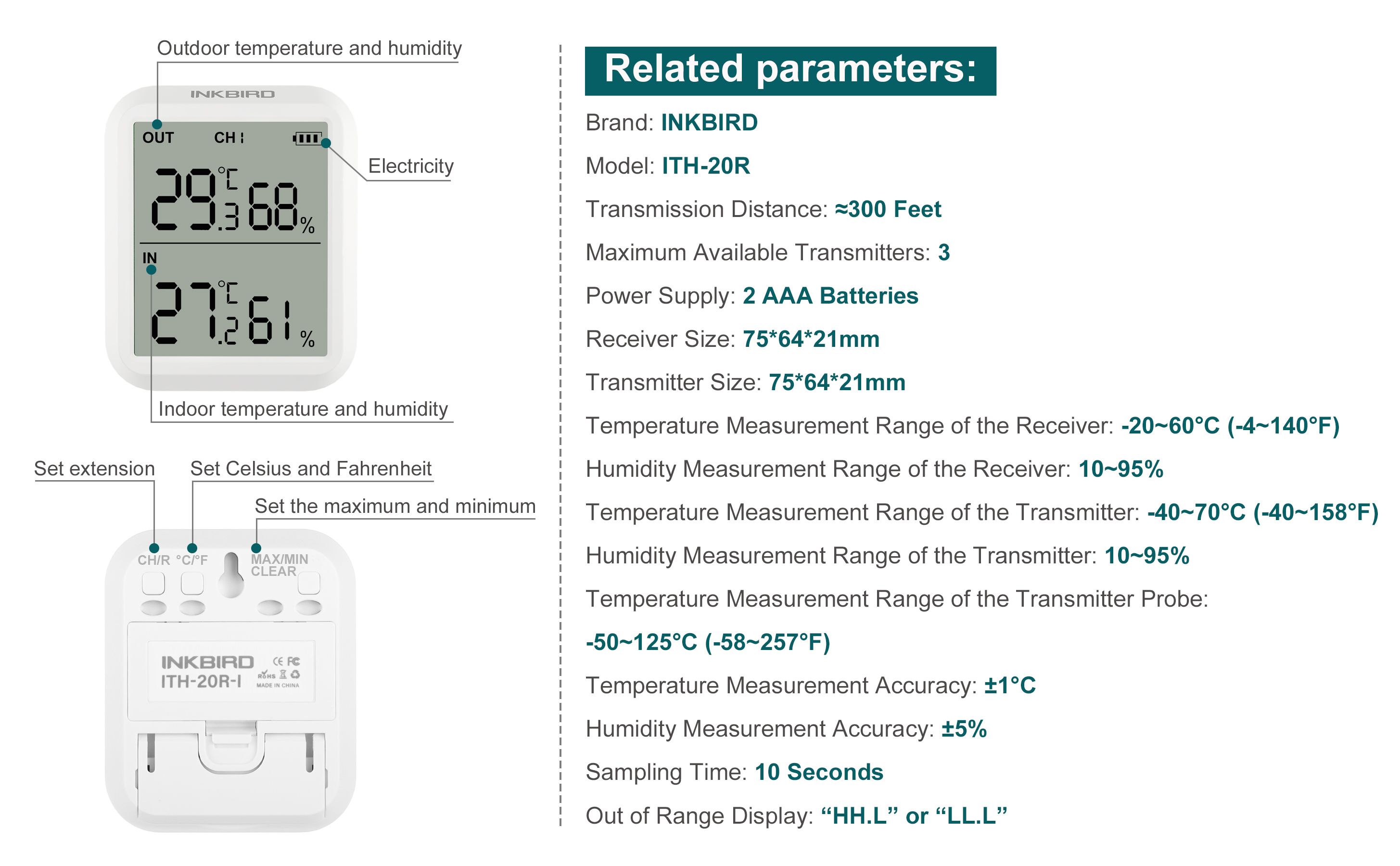 ITH-20R Weather Station and Hygrometer Large Backlight LCD Outdoor&Indoor Inkbird Unit for House Kitchen Courtyard