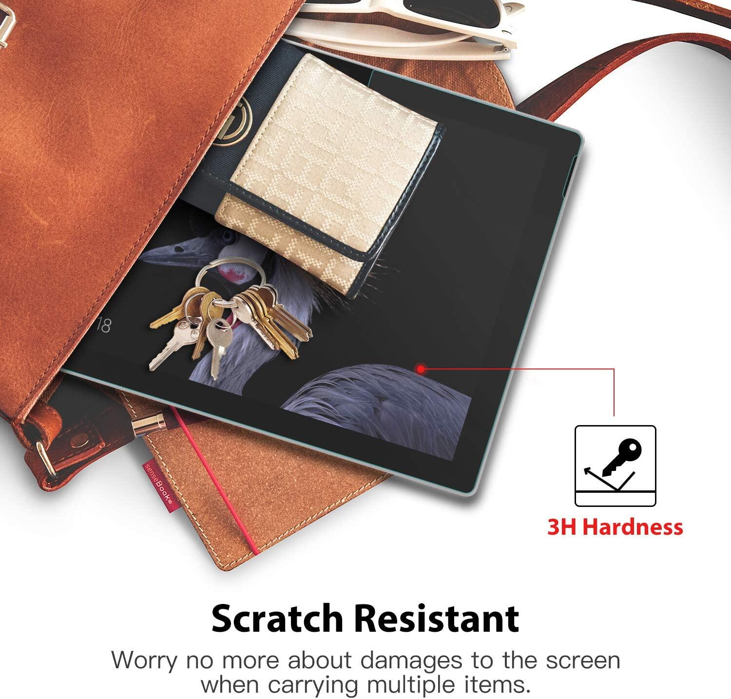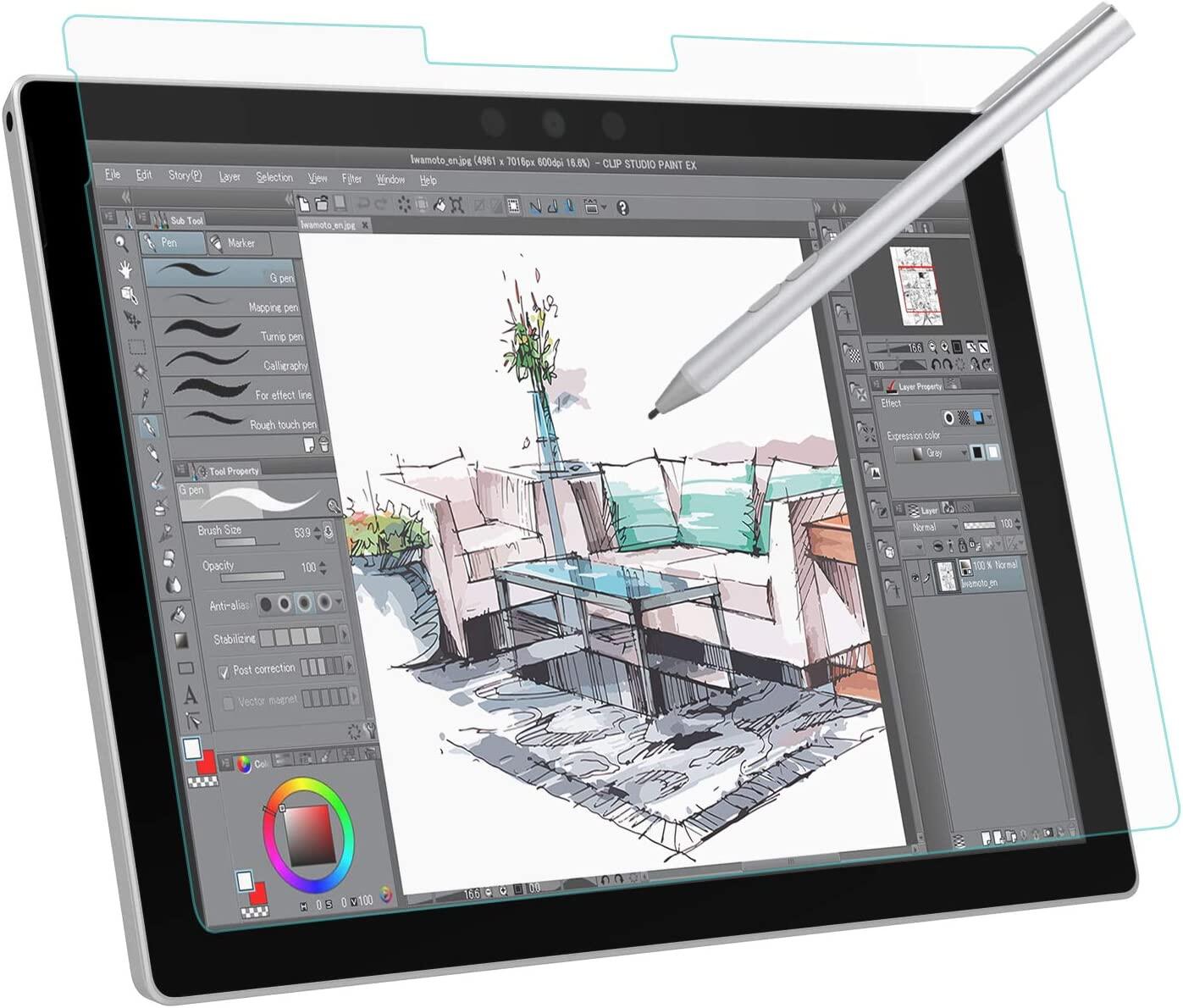 Premium PET Material, the matte surface reduces reflections of the sun, so you can enjoy the sun on your skin and keep it away from your display. And the rough texture gives you more control when drawing with the Surface Pen. The slide of the pen feels just like you're writing on paper. It is the excellent protective PET film specifically for those who draw pictures with Surface Pen.