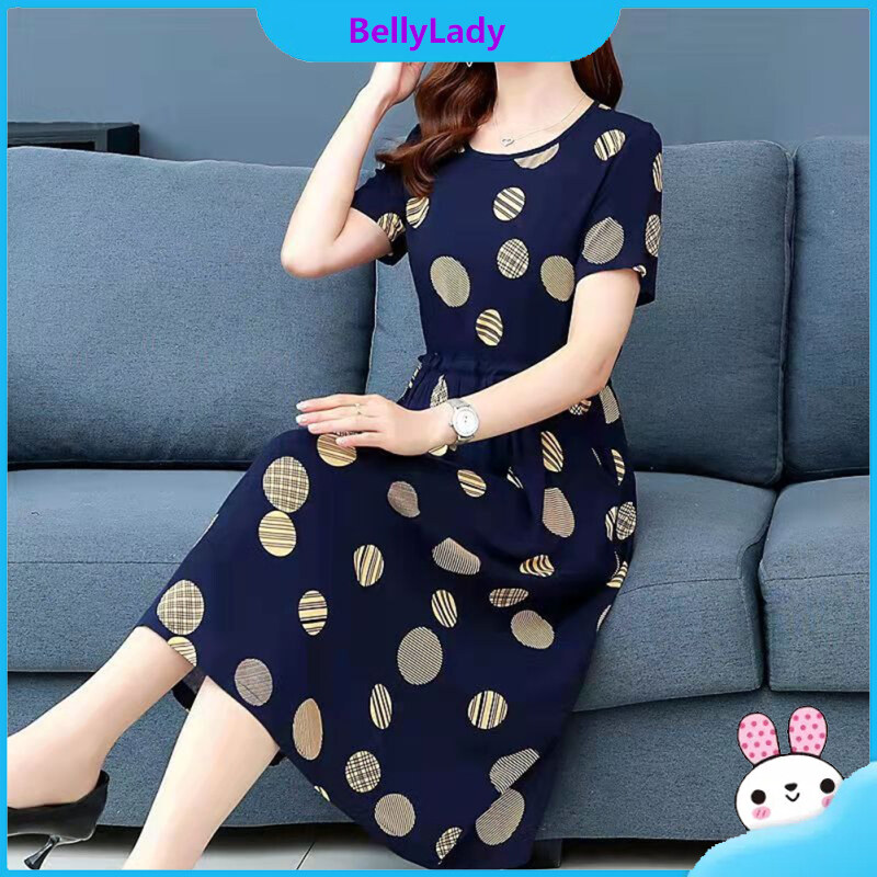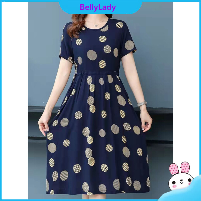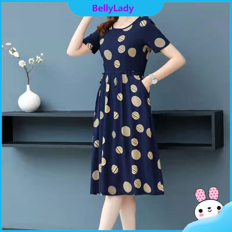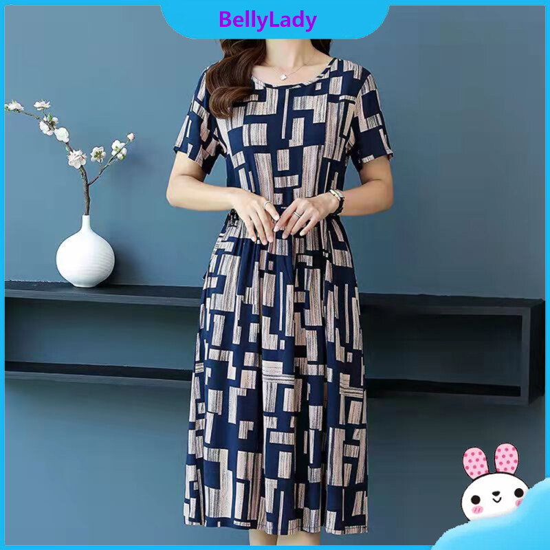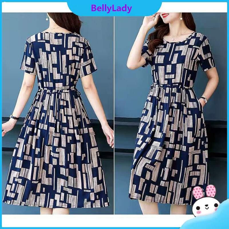 Women Summer Short Sleeves Dress Elegant Stylish Printing Round Neck Midi Skirt Large Size Loose Casual Dress