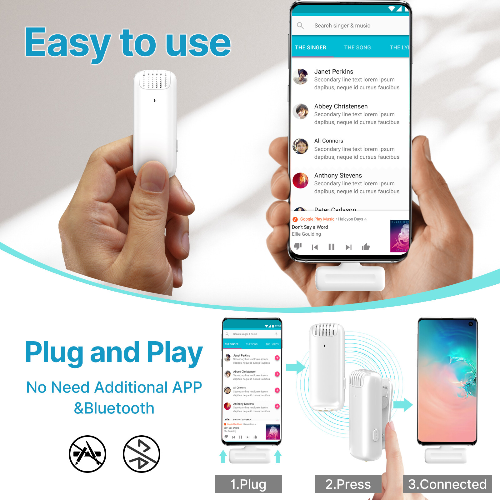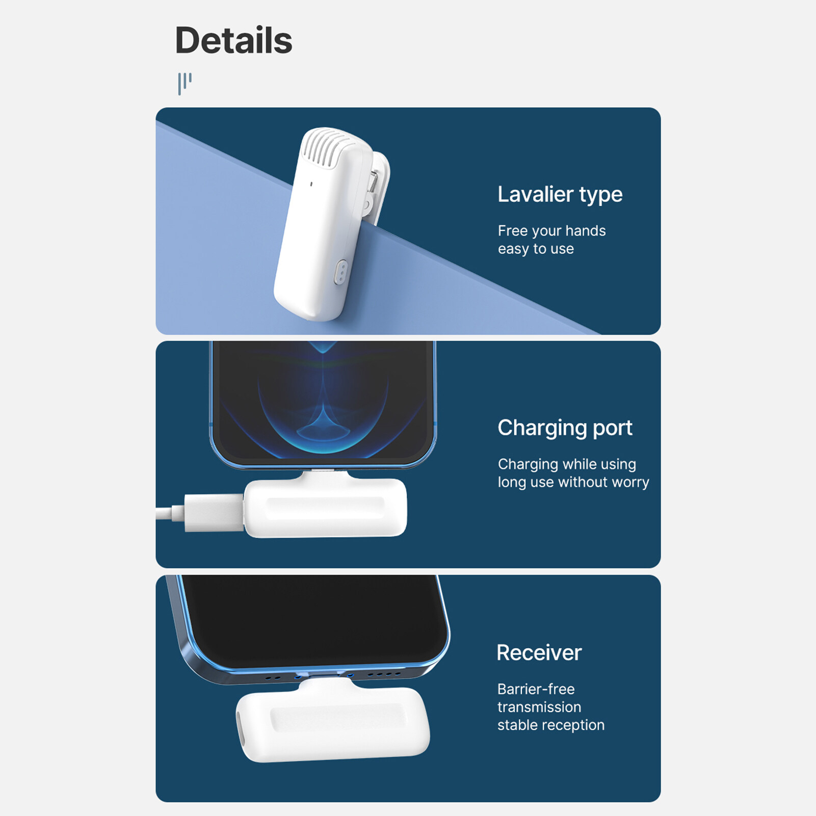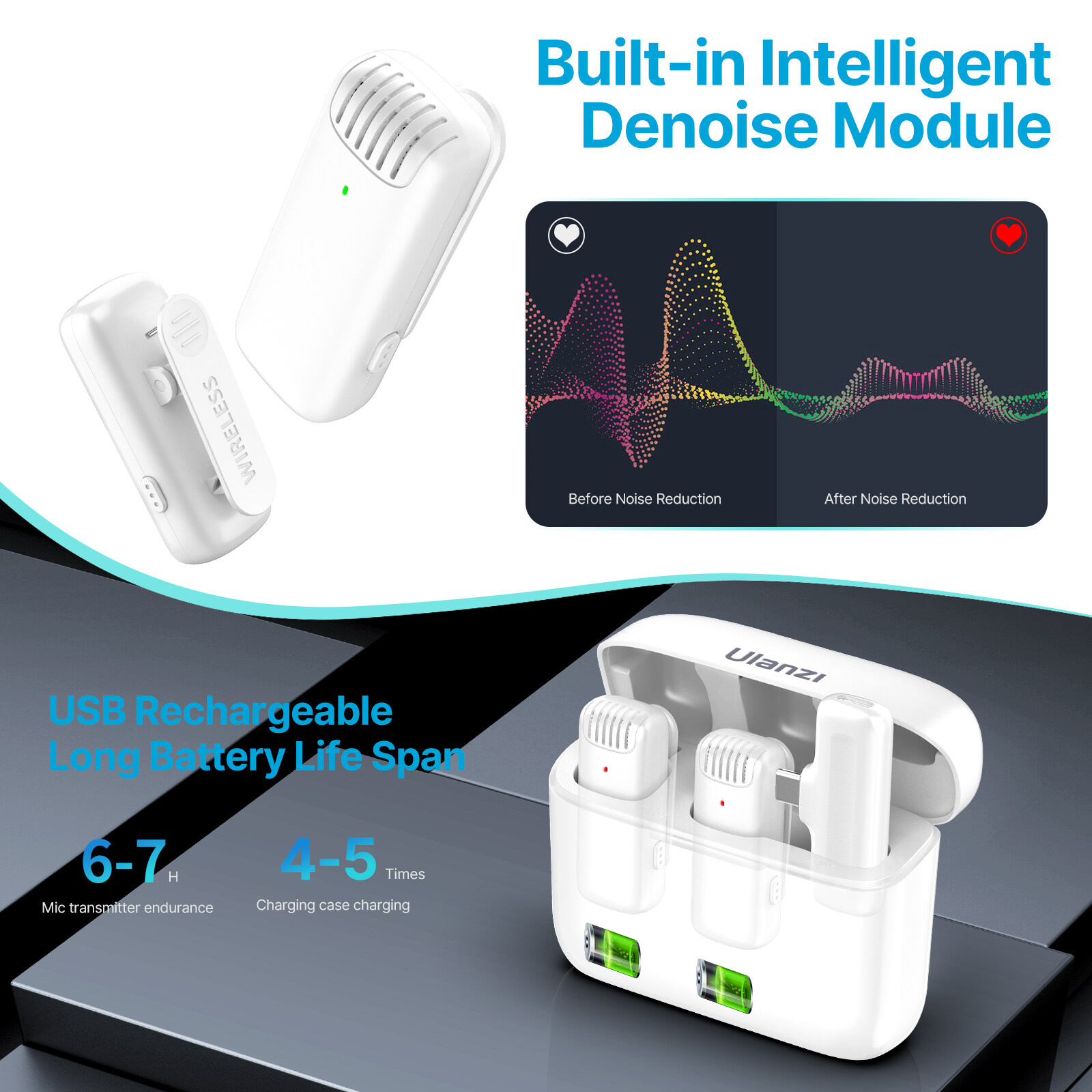 Including 1 receivers & 2 microphone transmitters, supports dual microphone simultaneous recording, plug-and-play, no APP needed, very suitable for phone vlog, live streaming, interview, online chatting, etc.