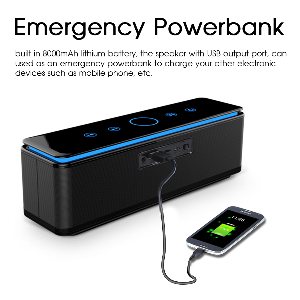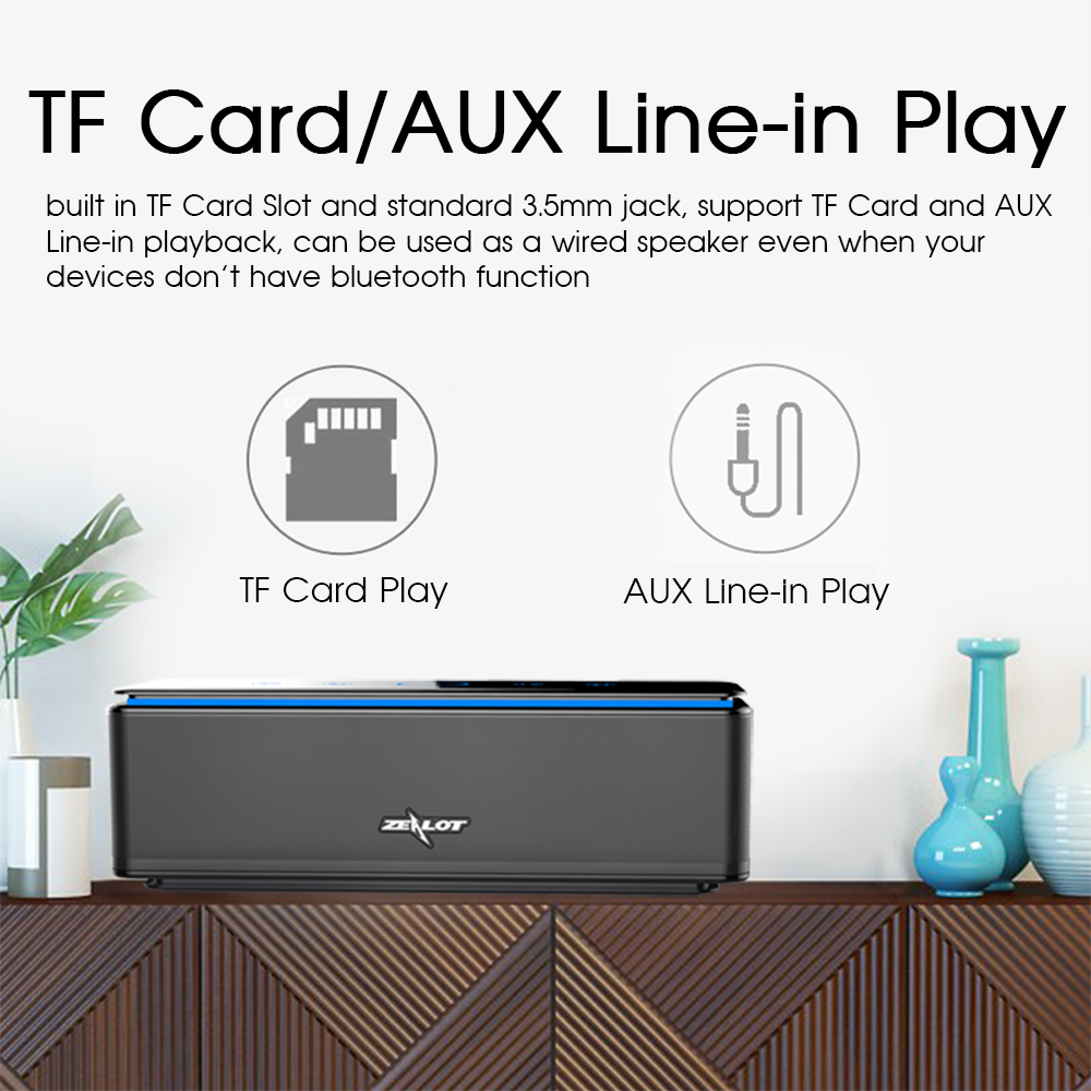 8). built in a AUX audio jack, connect the speaker to any devices by a 3.5mm audio cable to listen to music, just like a wired speaker, even when your devices without bluetooth, it still works.