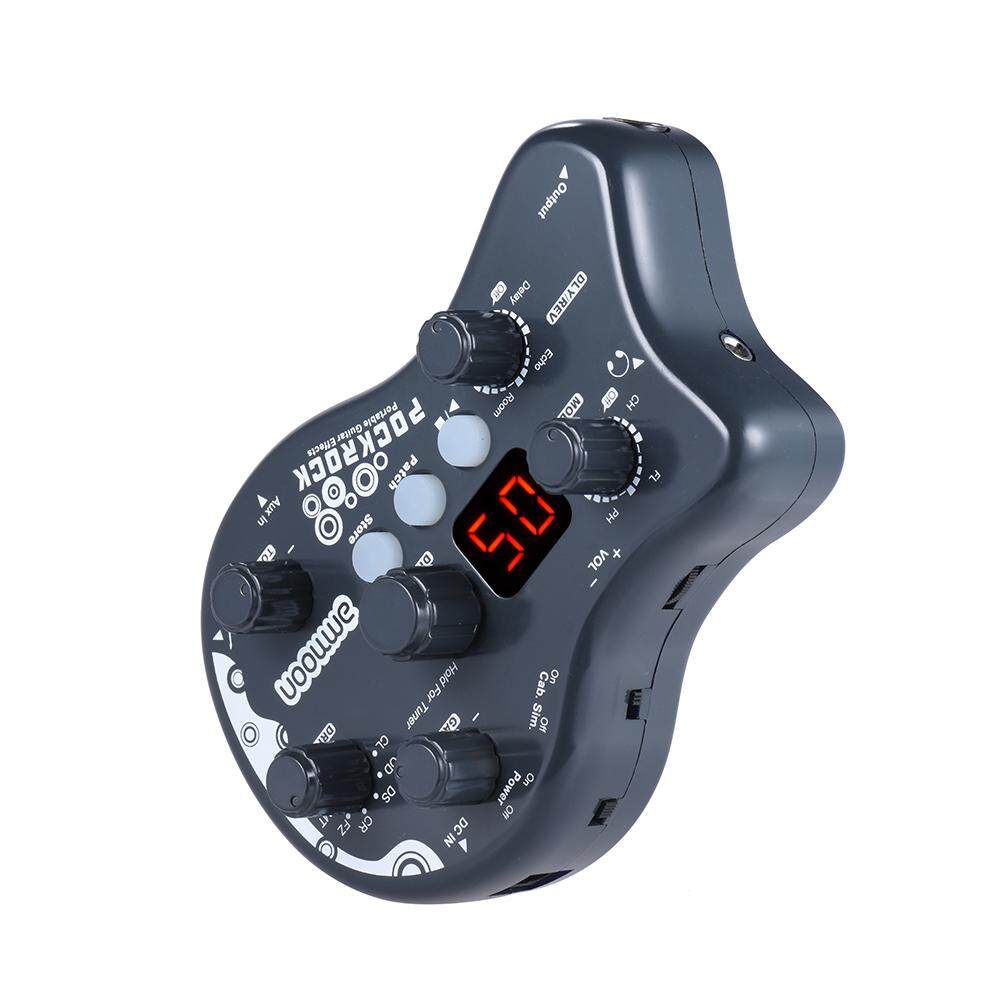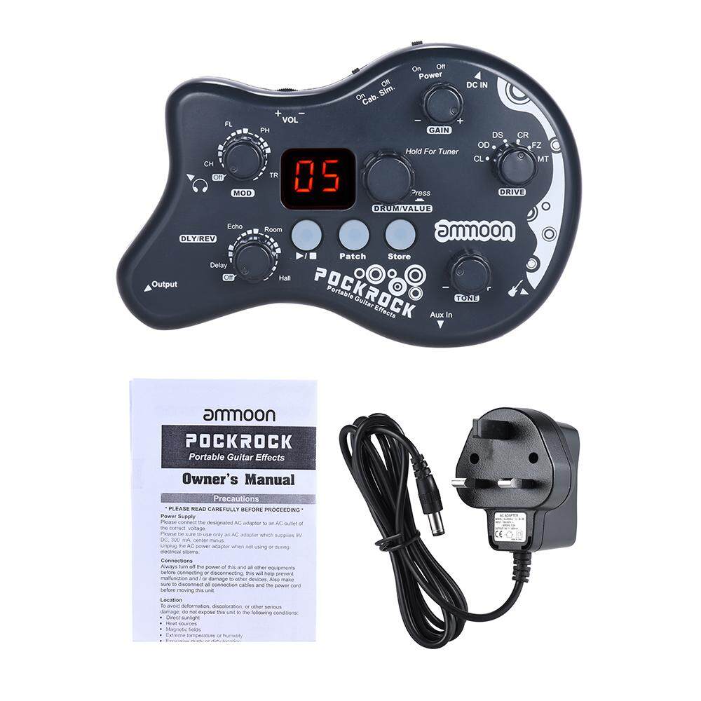 ammoon PockRock is a portable guitar multi-effects pedal. 5 effect modules with 15 effect types, 40 drum rhythms, 16 preset patches and 16 user patches. It is not only a sound library, but also allows you to create your own sound library. With headphone out and AUX in, you can enjoy your playing at night and no need to worry about disturbing others.