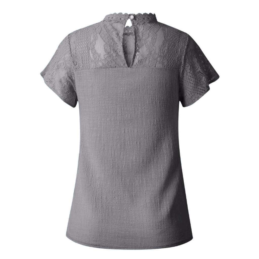 Womens Lace Patchwork Flare Ruffles Short Sleeve Cute Cotton Shirt Blouse Top