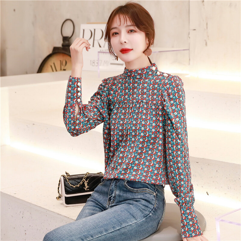 AFEG new Korean Women long sleeve retro print casual fashion wild temperament elegant blouses