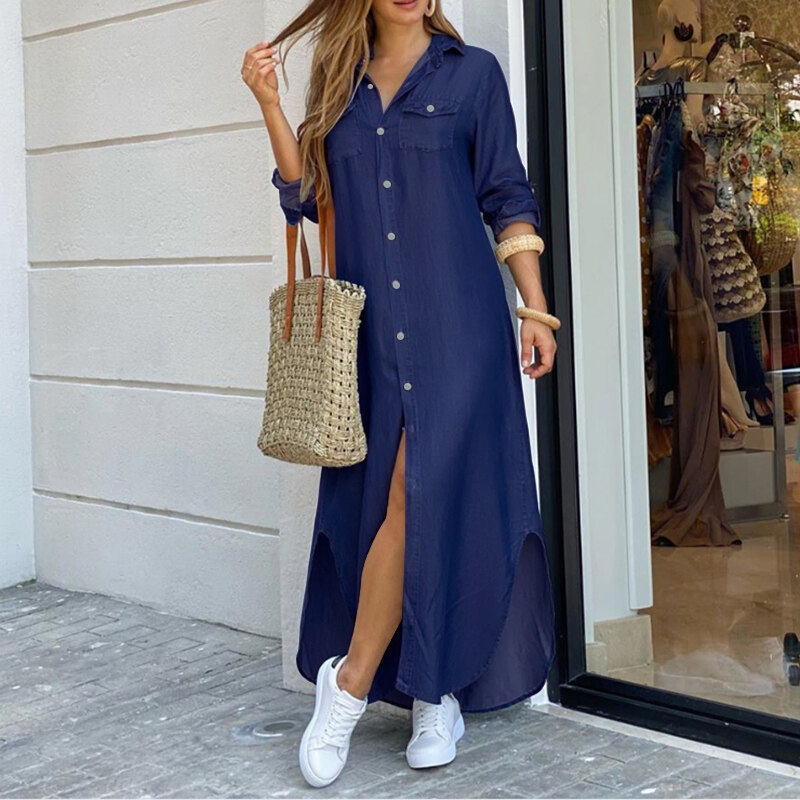 ZANZEA Womens Holiday Long Sleeve Button Down Denim Maxi Shirt Dress Plus Size