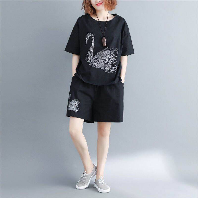 2021summer Fat Women's Sportswear Short-Sleeved Shorts New Embroidered Loose Large Size Slimming for Plump Girls Two-piece Set