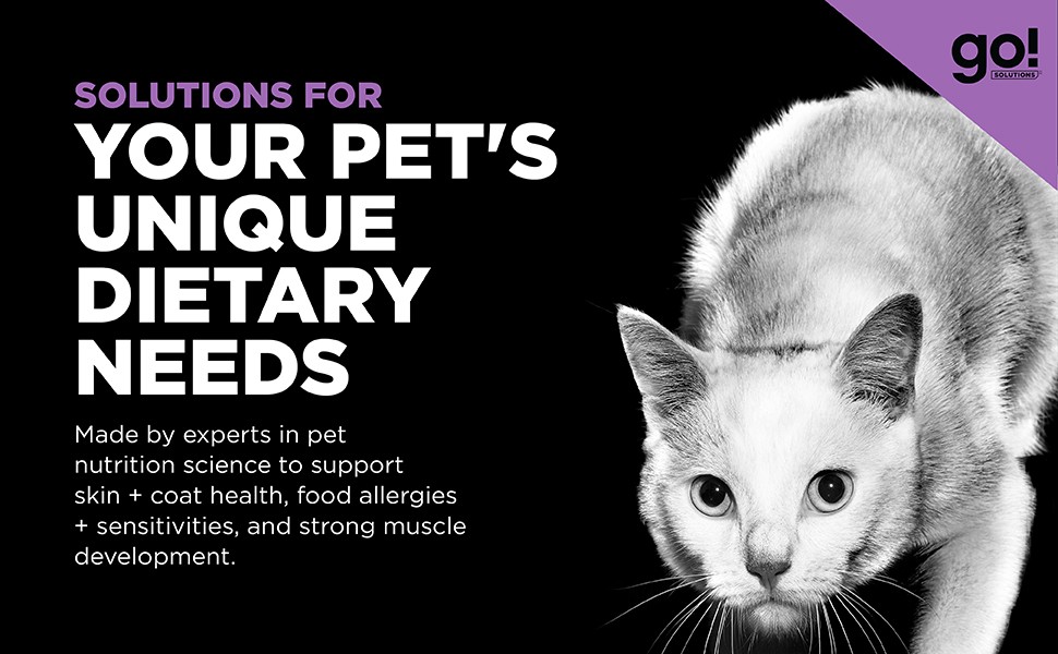MADE BY PET NUTRITION EXPERTS: Each nutrient-rich GO! SOLUTIONS healthy cat food recipe has been crafted by a team of qualified and passionate pet nutritionists to provide solutions for your cat's unique dietary needs and care throughout life.